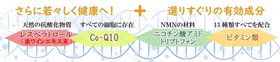 β-ニコチンアミド・モノヌクレオチド(国内製造)、ニコチン酸アミド、コエンザイムQ10/HPMC、L-トリプトファン、ビタミンC、ビタミンE、ビタミンB2、ビタミンB6、ビタミンB1、ビタミンA、葉酸、ビタミンK、ビオチン、ビタミンD、ビタミンB12、赤ワインエキス末、パントテン酸カルシウム、アラビアガム、微粒二酸化ケイ素、ステアリン酸カルシウム、澱粉、マルトデキストリン