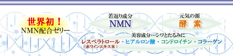 果糖ブドウ糖液糖(国内製造)、イソマルトオリゴ糖、難消化性デキストリン、植物発酵エキス(オリゴ糖、砂糖、甜菜糖、ヨモギ、その他)、β-ニコチンアミド・モノヌクレオチド、赤ワインエキス末(レスベラトロール含有)、鮫軟骨抽出末(コンドロイチン含有)、コラーゲンペプチド / ヒアルロン酸、ゲル化剤(増粘多糖類)、酸味料、香料